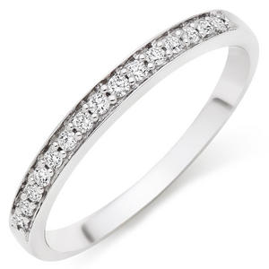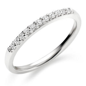 Simply beautiful, this stunning 18ct white gold diamond ring will always make you feel like a princess. A wonderful token of your love for one another, this lovely ring will always remind you of your wedding day. The glittering row of eleven brilliant cut diamonds are claw set in 18ct white gold for a style that is contemporary but timeless, creating a striking effect with plenty of sparkle and fire. Wonderfully designed and finished, this gorgeous ring will make you feel truly bridal. Diamond information: Cut – round brilliant, Colour – G, Clarity – SI1, Carat weight – 0.11ct. Please note there could be a 5% variance on the diamond carat weight, as every diamond is unique.