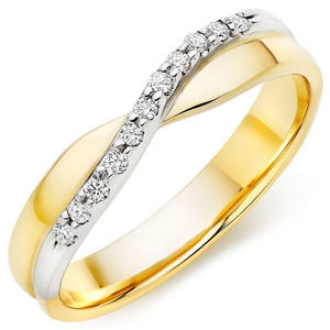 A glamorous and dazzling ring, this 9ct gold and white gold diamond ladies wedding ring will take your breath away. Filled with sparkle, this gorgeous ring is designed in a modern mix of 9ct gold and white gold with a beautiful, flowing design, embellished even further by the sparkling round brilliant diamonds that glisten beautifully on the 9ct white gold. A gorgeous design to sit next to your engagement ring, this romantic wedding ring will always remind you of your special day. Diamond information: Cut – round brilliant, Colour – H, Clarity – SI1, Carat weight – 0.09ctPlease note there could be a 5% variance on the diamond carat weight, as every diamond is unique.