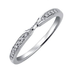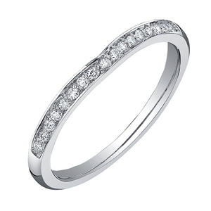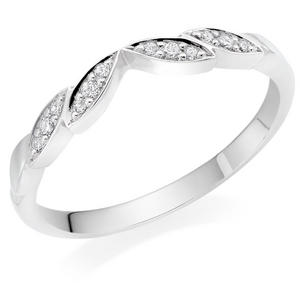 18ct White Gold Diamond Shaped Wedding Ring. A delicately curved 18ct white gold wedding band set with a single row of stunning diamonds along the top. Diamond information: Cut-Brilliant, Colour-H, Carat 0.15ct, Clarity-SI1.. Please note there could be a 5% variance on the diamond carat weight, as every diamond is unique.