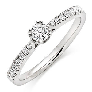 The epitome of romance, this 18ct White Gold Diamond Solitaire Ring swirls with breathtaking sparkle. At A Glance Crafted in 18ct white gold Dazzles with a round brilliant diamond in centre stage Held in a modern four claw setting Beautiful diamond set shoulders Turn the ring to the side to reveal a romantic heart symbol Diamond cut – round brilliant Diamond colour – G Diamond clarity – Si1 Total diamond carat weight – 0.34ct Please note there could be a 5% variance on the diamond carat weight, as every diamond is unique