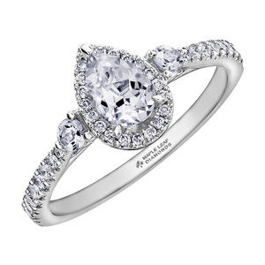 The perfect symbol of your everlasting love, this Maple Leaf Diamonds 18ct White Gold Pear-Shaped Diamond Ring is loved for the dazzling pear-shaped diamond and glittering halo of round brilliant diamonds. At A Glance PureWhite gold band, made from 18ct Canadian gold and palladium alloy for a bright white colour Round brilliant diamond set shoulders Pear-shaped Canadian diamond Diamond halo with round brilliant diamonds Diamond colour – G Diamond Clarity – SI1 Diamond carat weight – 0.72ct Please note there could be a 5% variance on the diamond carat weight, as every diamond is unique