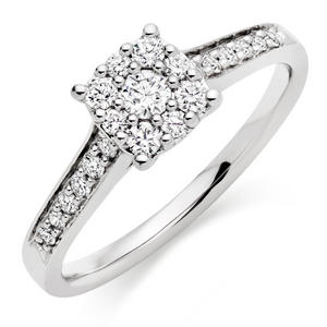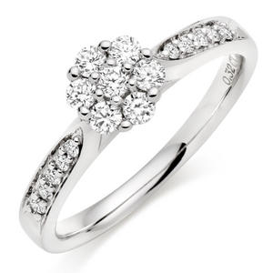 Simply beautiful, this stunning Platinum Diamond Cluster Ring has been designed to create the beautiful illusion of a much larger stone. Certain to take any girls breath away, this gorgeous diamond ring will make you feel like a princess. At A Glance Central cluster of brilliant cut diamonds Glamorous stone set shoulders Presented in a polished platinum setting Diamond cut – round brilliant Diamond colour – G Diamond clarity – SI1 Total diamond carat weight – 0.32ct Please note there could be a 5% variance on the diamond carat weight, as every diamond is unique