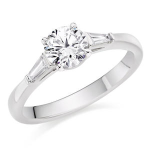 A vintage design of three beautiful diamonds to represent your past, present and future together, this Once Platinum Diamond Three Stone Ring will definitely sweep them off their feet. At A Glance Part of our exclusive Once collection Crafted in a polished platinum band Breathtaking round brilliant diamond takes centre stage Two baguette cut diamonds sit either side the centre stone Diamond cut – round brilliant and baguette cut Diamond colour – G Diamond clarity – Si1 Total diamond carat weight – 1.02ct Please note there could be a 5% variance on the diamond carat weight, as every diamond is unique