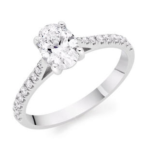 Surprise them with this breathtaking Platinum Diamond Oval Cut Solitaire Ring. The unique oval solitaire diamond creates a vintage look she will treasure forever. At A Glance Crafted in polished platinum Solitaire oval cut diamond Diamond embellished shoulders Diamond cut – oval-cut and round brilliant Diamond colour – G Diamond clarity – Si1 Total diamond carat weight – 0.63ct Please note there could be a 5% variance on the diamond carat weight, as every diamond is unique