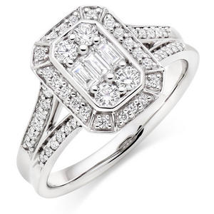 An absolutely show-stopping design, this stunning Platinum Diamond Cluster Halo Ring fully embraces the trend for vintage-inspired style. At A Glance Made from platinum Central cluster of elegant emerald and brilliant cut diamonds Halo of smaller diamonds Diamond set split shoulders Diamond cut – emerald cut and round brilliant Diamond colour – G Diamond clarity – SI1 Total diamond carat weight – 0.57ct Please note there could be a 5% variance on the diamond carat weight, as every diamond is unique