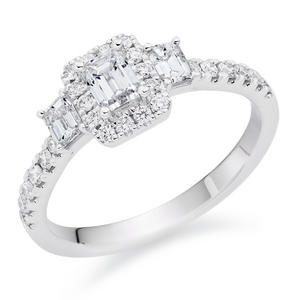 The most glamorous sparkle, this vintage-inspired engagement ring will definitely take their breath away. Propose to your love in style with this stunning Platinum Diamond Emerald Cut Three Stone Halo Ring. At A Glance Crafted in polished platinum Beautiful emerald cut diamond takes centre stage with a halo of sparkling diamonds surrounding it Two round brilliant diamonds sit either side of the halo Diamonds embellish the band’s shoulders Diamond cut – emerald cut and round brilliant Diamond colour – G Diamond clarity – SI1 Total diamond carat weight – 0.85ct Please note there could be a 5% variance on the diamond carat weight, as every diamond is unique