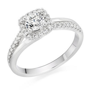 Guaranteed to make you fall in love at first sight, this stunning Platinum Diamond Halo Ring will make you feel like a princess. Each stone as unique as a snowflake, this stunning diamond ring is designed to be treasured for a lifetime. At A Glance Brilliant cut diamond takes centre stage Dazzling halo of smaller stones Set in an eye-catching four claw setting Presented on a polished platinum band Glittering row of diamonds on each shoulder Diamond cut – round brilliant Diamond colour – G Diamond clarity – SI1 Total diamond carat weight – 0.40ct Please note there could be a 5% variance on the diamond carat weight, as every diamond is unique