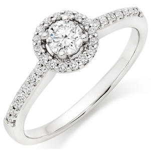 Showcasing timeless beauty and sparkle, this gorgeous 18ct White Gold Diamond Halo Ring is the most beautiful symbol of everlasting love. The definition of luxury, this exquisite ring will be the perfect setting for the most romantic proposal. At A Glance Beautiful central brilliant diamond Modern four claw setting Glistening halo of smaller brilliant diamonds Presented on an 18ct white gold band Channel set diamonds on the ring’s shoulders Diamond cut – round brilliant Diamond colour – G Diamond clarity – SI1 Total diamond carat weight – 0.40ct Please note there could be a 5% variance on the diamond carat weight, as every diamond is unique
