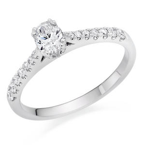 Sophisticated sparkle is what this 18ct White Gold Diamond Oval Cut Ring is all about. A ring they will treasure forever, propose to your love and take their breath away. At A Glance Crafted in 18ct white gold Stunning oval cut solitaire Diamonds embellish the beautiful polished band Diamond cut – oval cut and round brilliant Diamond colour – G Diamond clarity – SI1 Total diamond carat weight – 0.50ct Please note there could be a 5% variance on the diamond carat weight, as every diamond is unique