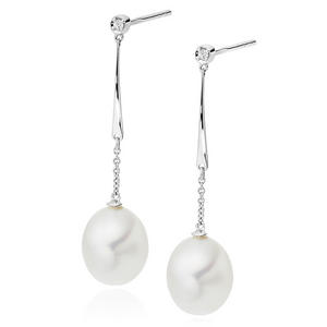 9ct White Gold Diamond Freshwater Cultured Pearl Drop Earrings