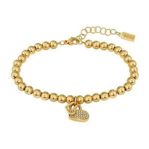Totally on trend, this Hugo Boss Gold Tone Beads Heart Ladies Bracelet is the perfect accessory to stack up with your favourite wristwear. At A Glance Crafted in gold tone plated stainless steel Heart pendant and heart pendant with clear crystal embellishment Boss logo detail Lobster clasp