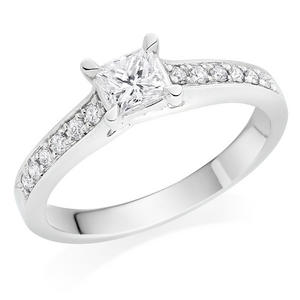A timeless choice, this Platinum Diamond Princess Cut Solitaire Ring is the most stunning way to begin your next romantic chapter with your loved one. At A Glance Princess cut diamond in the centre Modern four claw setting Polished platinum band Diamonds embellish the ring’s shoulders Diamond cut – princess cut, round brilliant Diamond colour – G Diamond clarity – Si1 Total diamond carat weight – 0.43ct Please note there could be a 5% variance on the diamond carat weight, as every diamond is unique
