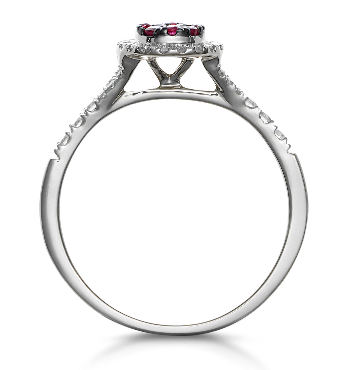 The magnificent red sparkle of rubies takes centre stage in this stunning halo ring. With radiant beauty, the rubies are contrasted and enhanced by the sparkle of sustainable lab grown diamonds. Pristine, polished white gold completes the high standard finish to make this a perfect gift for any special occasion.